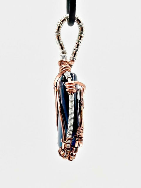 This pendant features a stunning cobalt blue shell that has been carefully handcrafted and wire wrapped in copper and silver wire. The shell has a natural iridescence that reflects the light and creates a beautiful contrast with the metallic wires. The pendant is elegant and unique, perfect for adding a touch of color and style to any outfit.