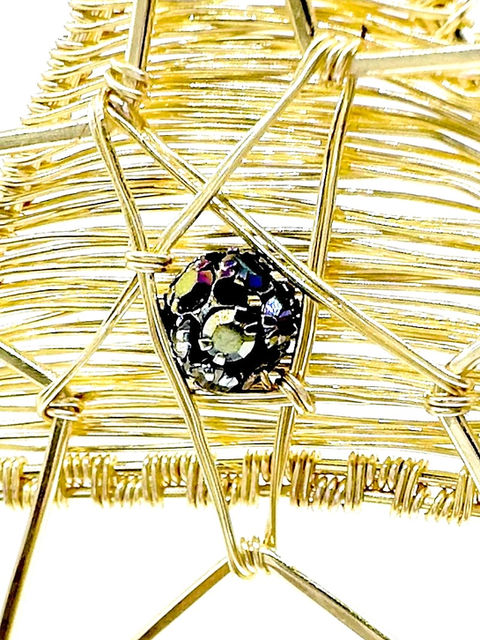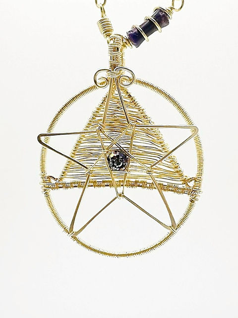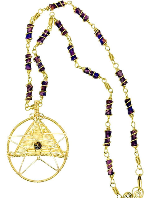 The necklace features a meticulously handcrafted chain adorned with 18 imperial jasper beads, each encased in a coiled brass wire, evoking the timeless artistry of the ancients. At the heart of the necklace, the Seba emblem is gracefully suspended, with an imperial jasper bead nestled within a wire-woven pyramid, a nod to the monumental structures that have stood for millennia.